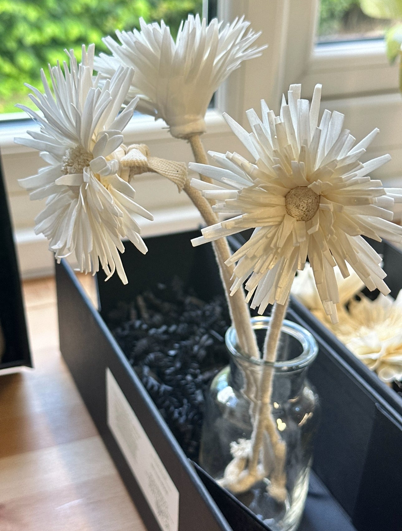 The flowers are made around a wick that is then inserted into the diffuser bottle and essential oil scent. The oil works its way up the wick and diffuses into the petals releasing the scent into the room.
