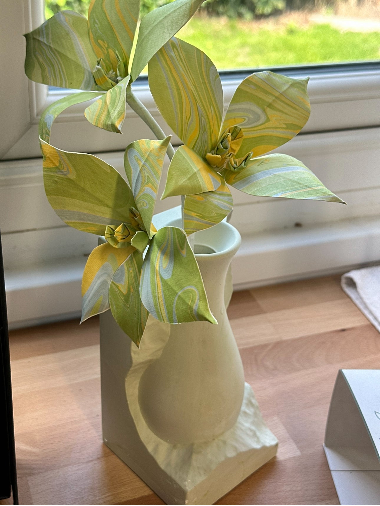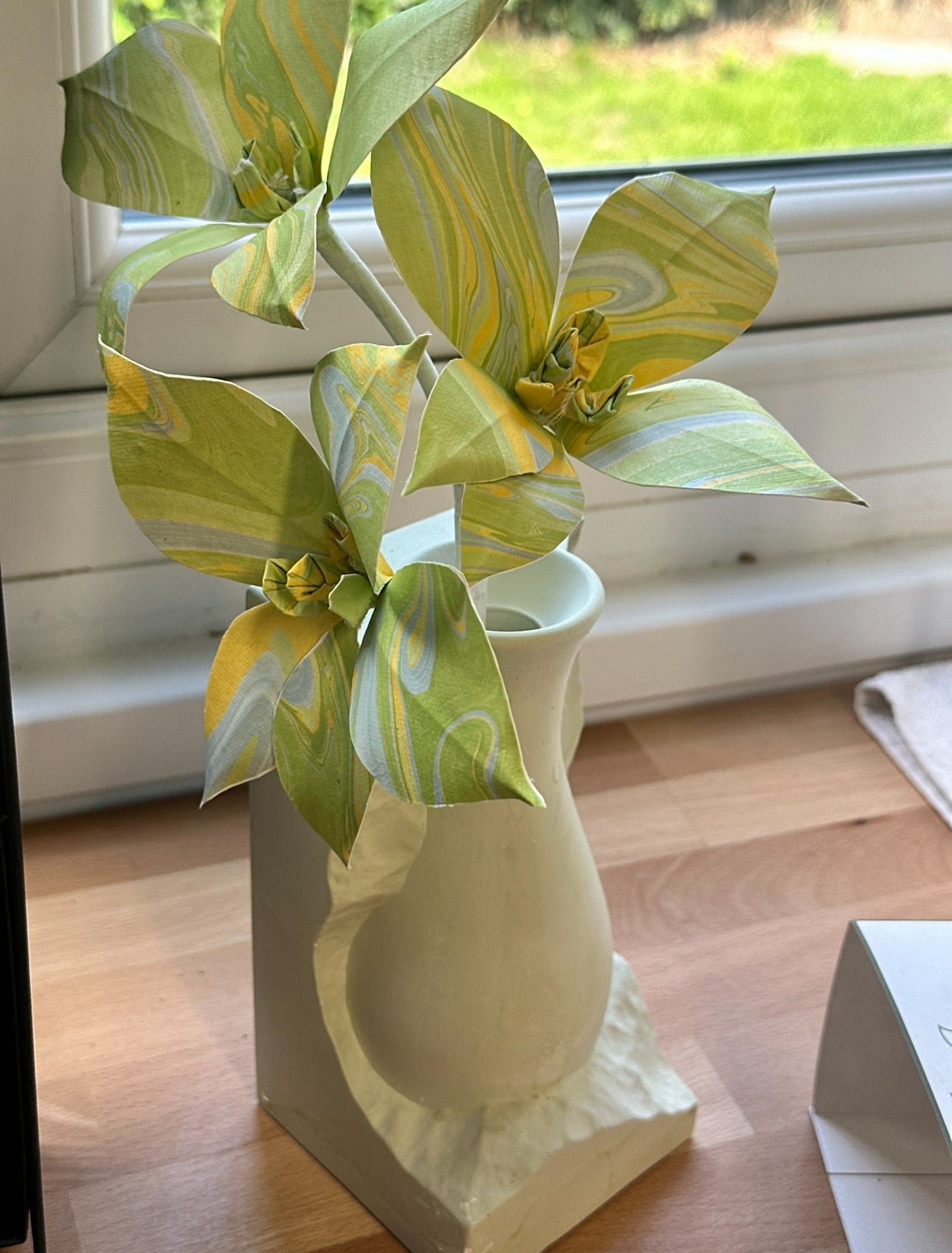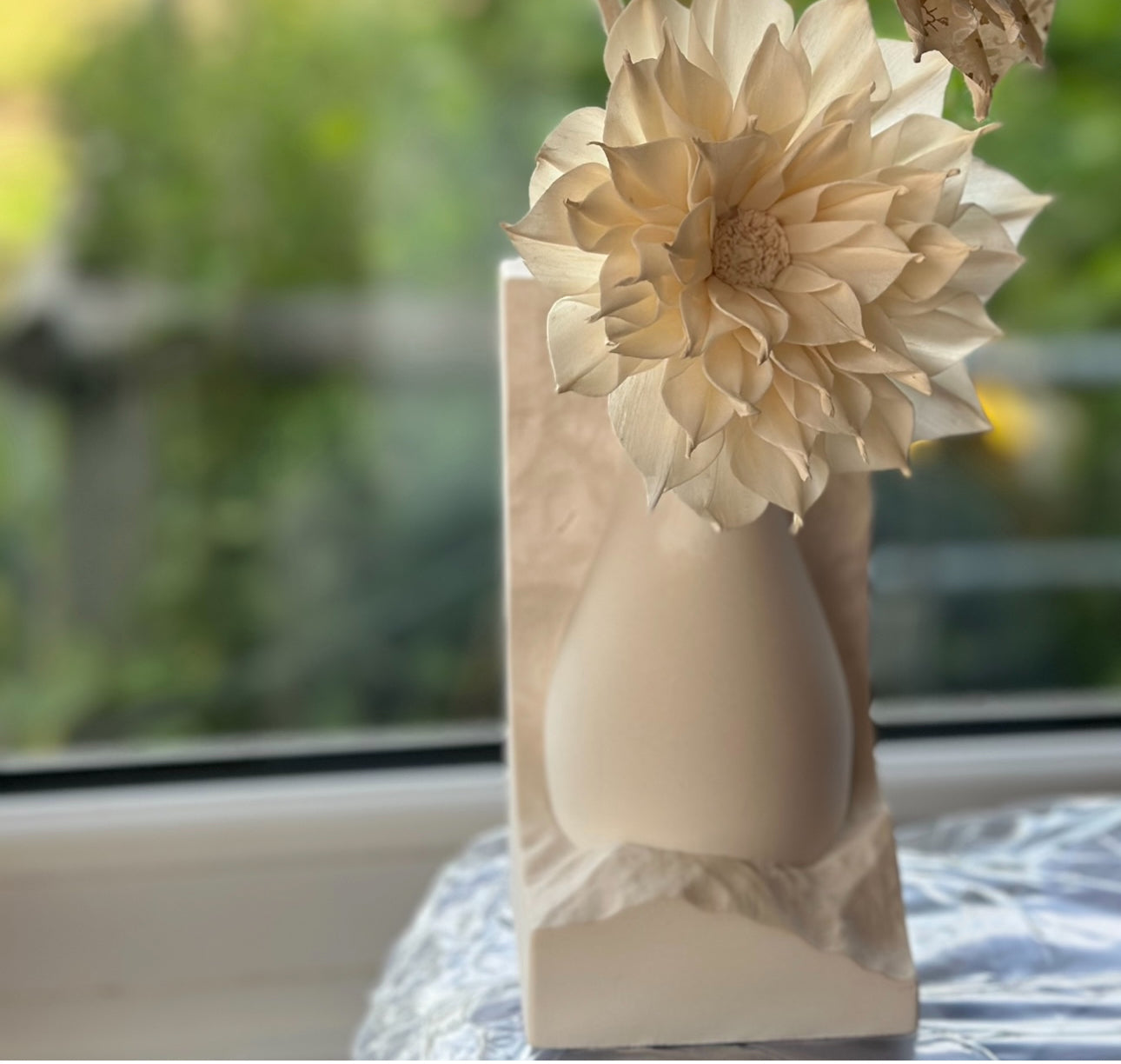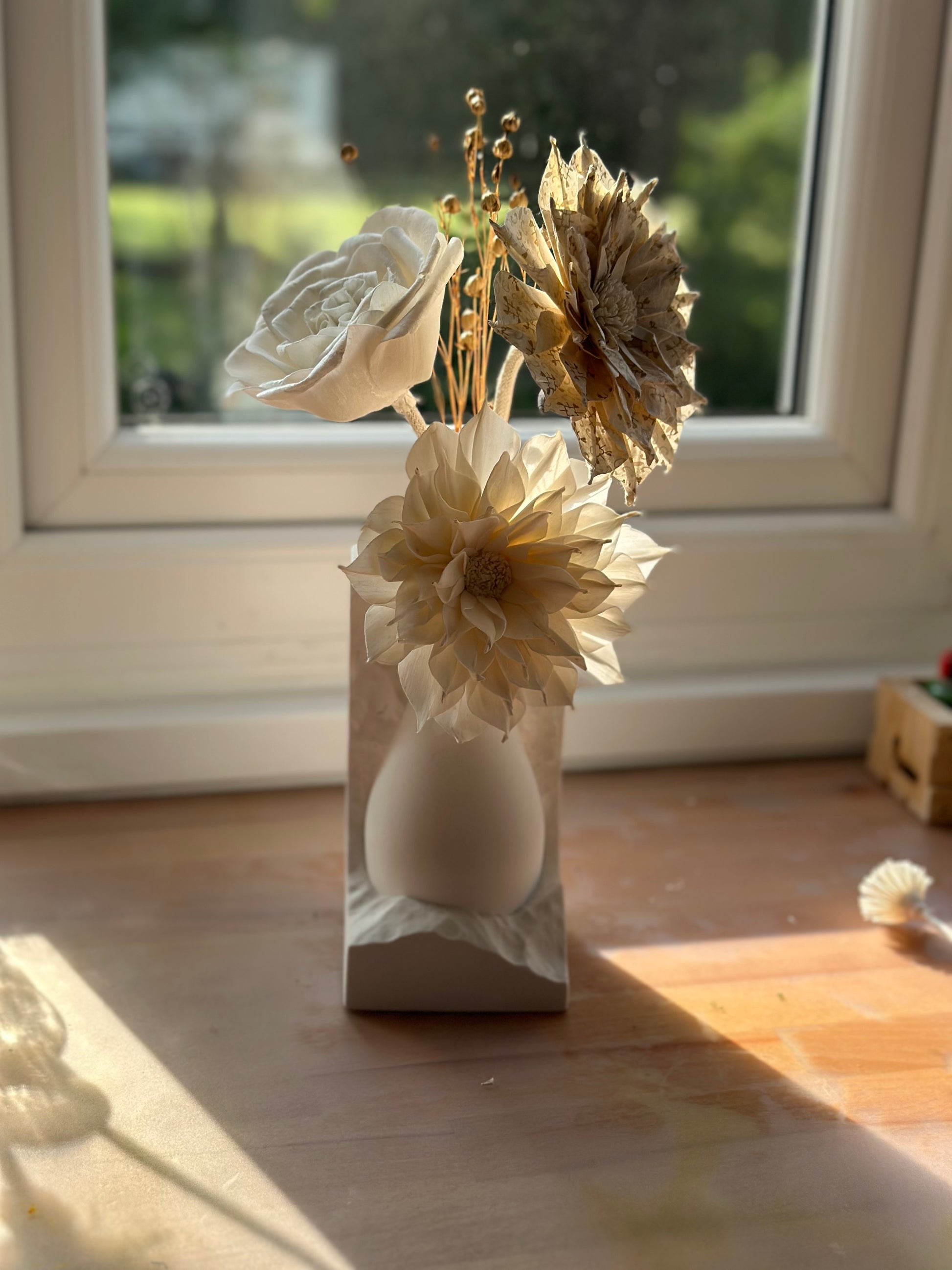 Discover the perfect fusion of raw beauty and refined artistry with our handcrafted concrete vase. This piece is more than just a vase; it's a sculptural work designed to captivate. Each one is meticulously created, ensuring a unique and enduring addition to your cherished spaces. Whilst made of gypsum, it emanates elegance and sophistication with the addition of the natural recycle paper diffuser blooms.
