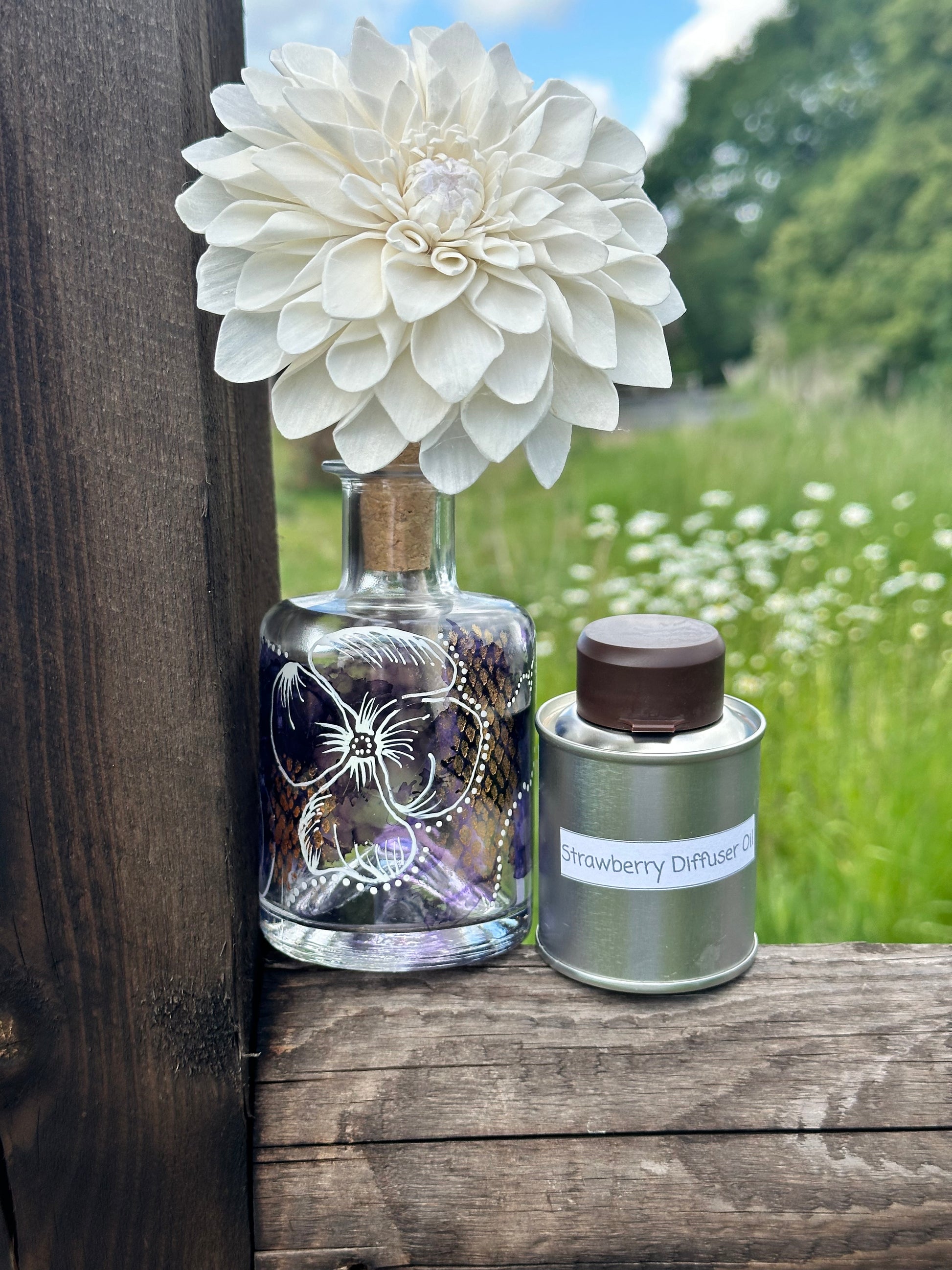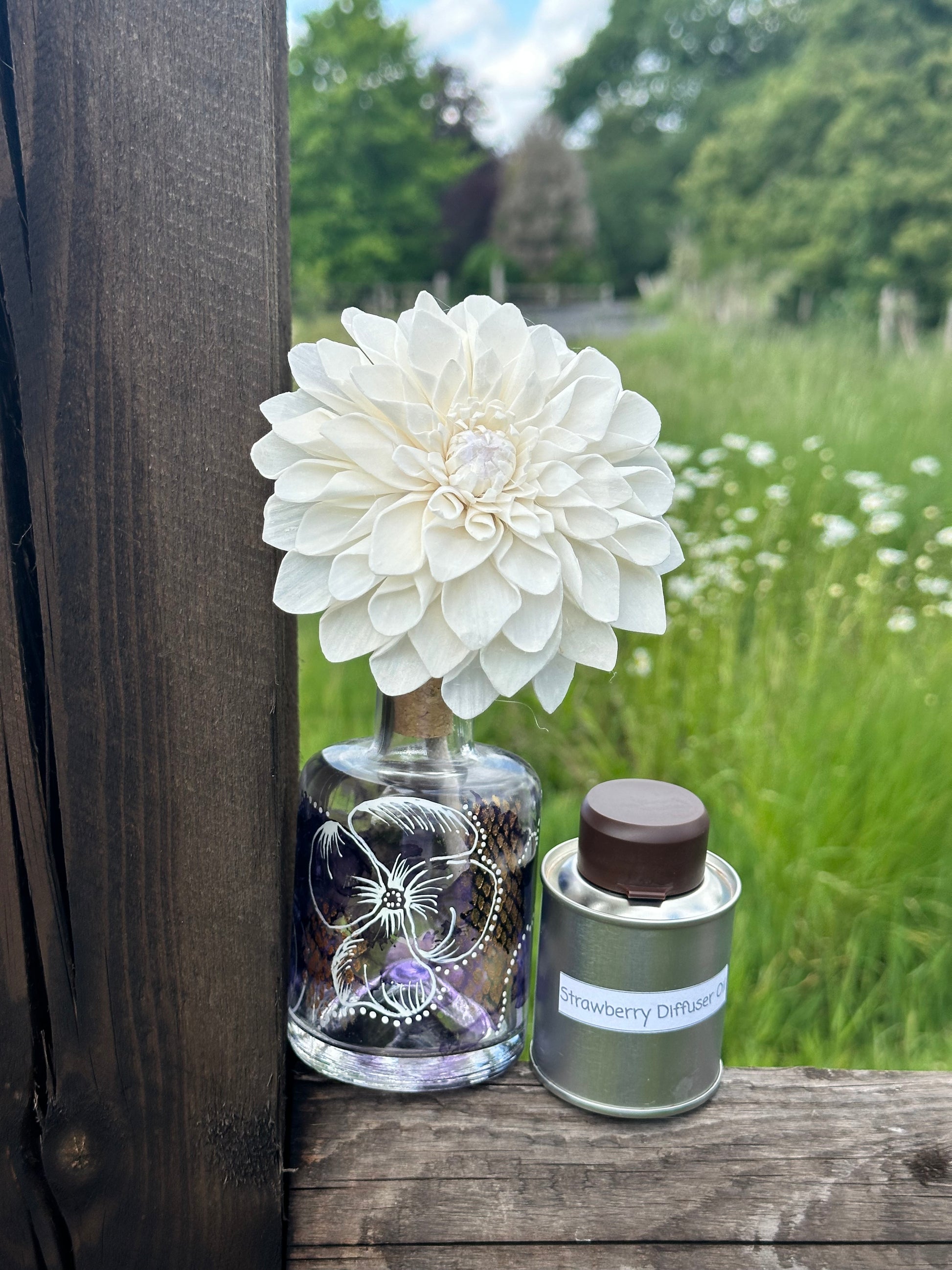 The flowers are made around a wick that is then inserted into the diffuser bottle and essential oil scent. The oil works its way up the wick and diffuses into the petals releasing the scent into the room.